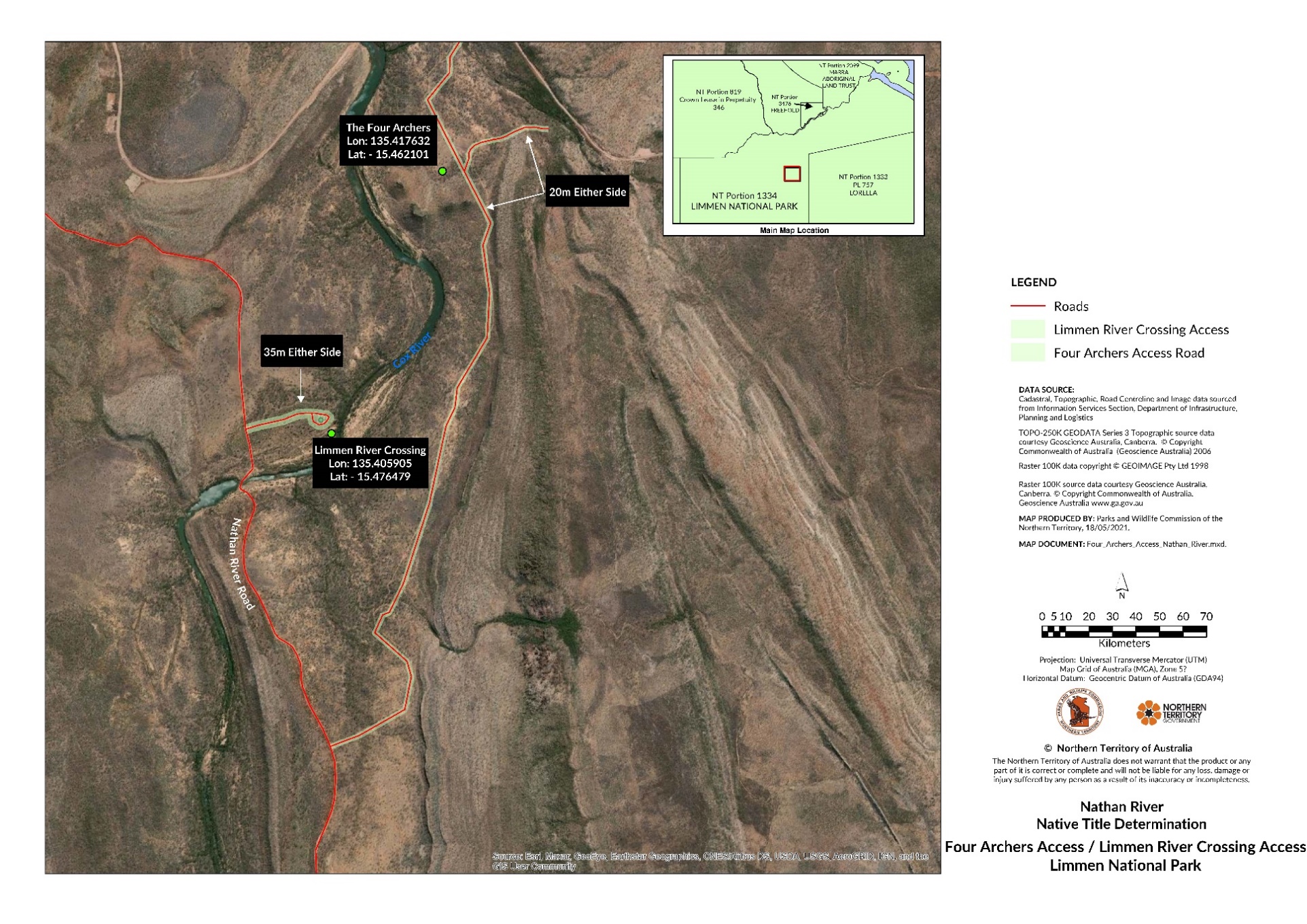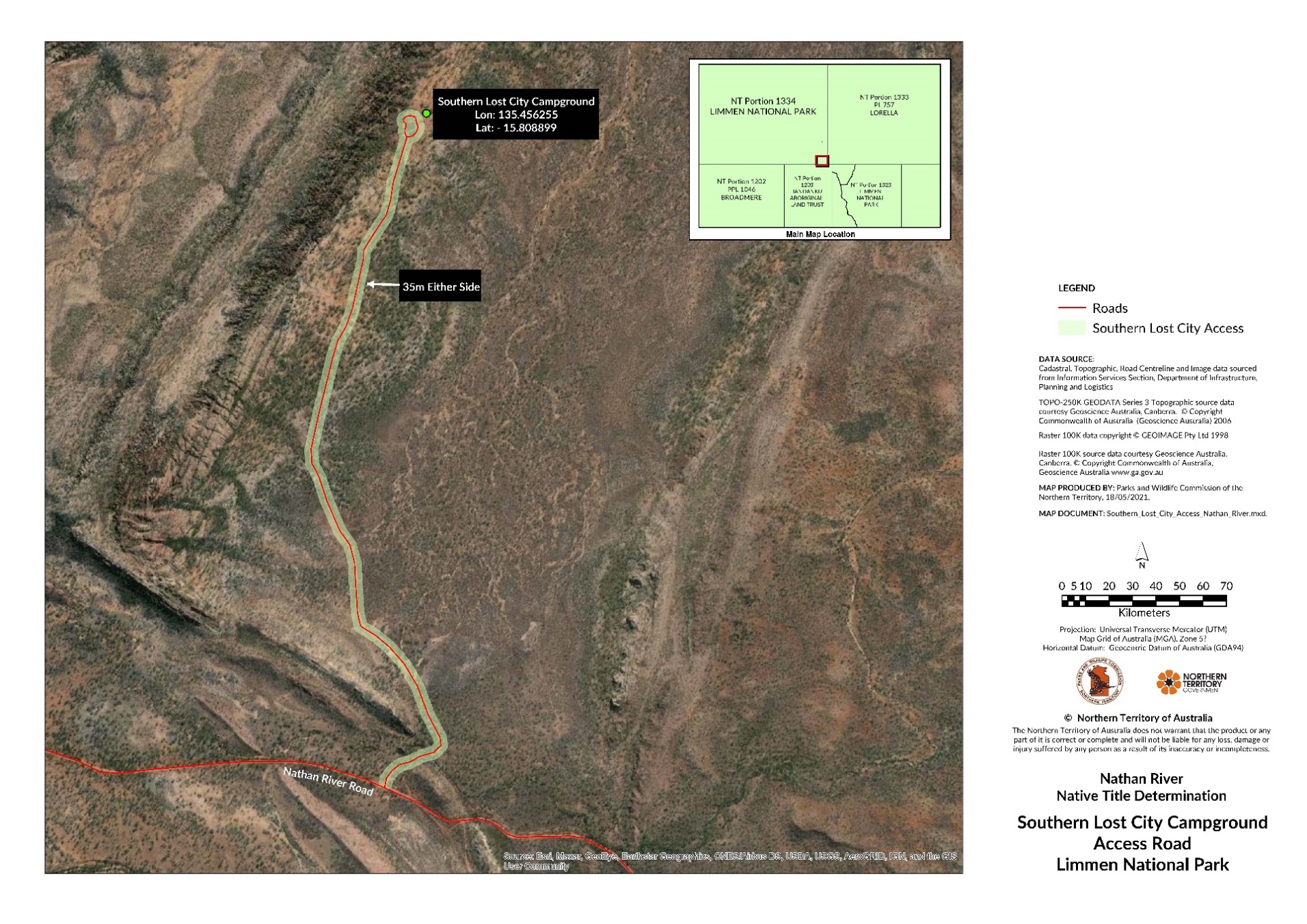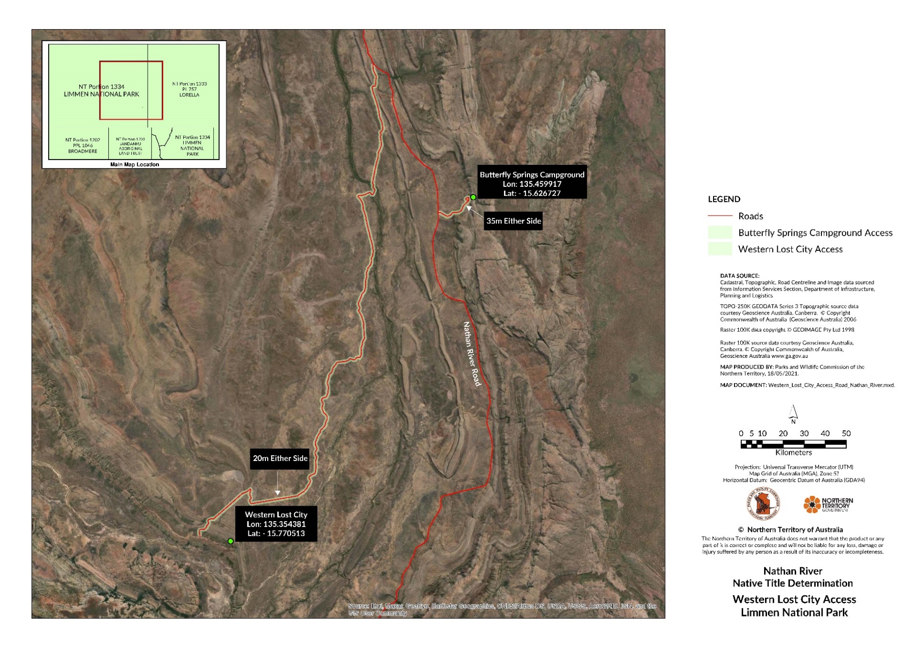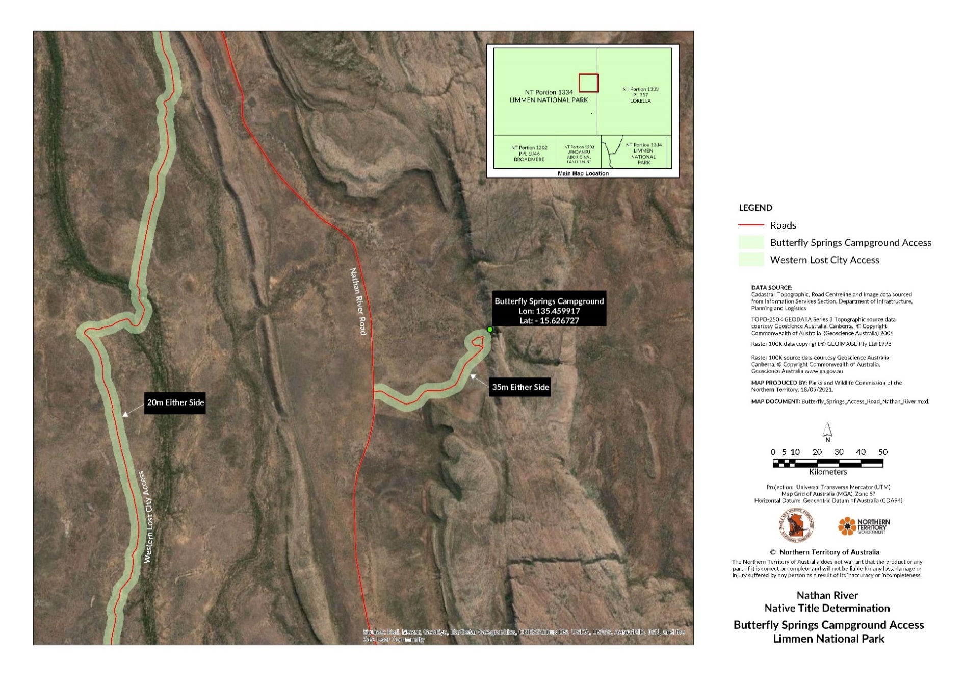 (i) Limmen River Crossing Road, Butterfly Springs Access Road, and Southern Lost City Access Road (where, for the purposes of this determination, the area of each Road is co-extensive with a 70m-wide corridor, 35m either side of the centreline of the Road); and