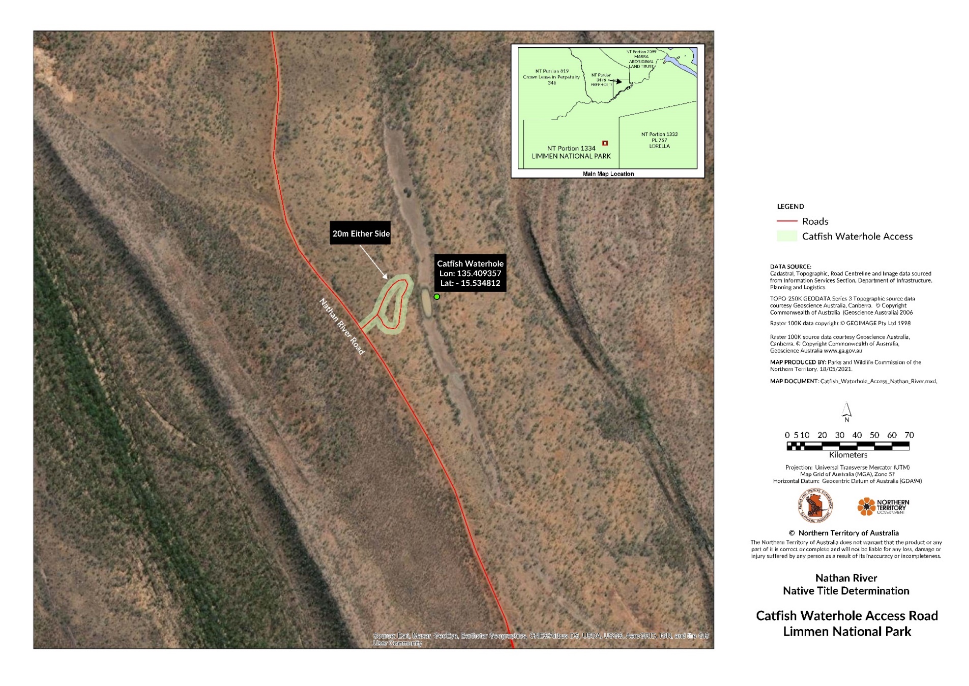 (a) that part of NT Portion 1334 comprising Nathan River Road 100m wide (50m either side of the centreline) commencing from the northern boundary of NT Portion 1334 to the southern boundary of this parcel as indicated on the Determination Map at Schedule B;