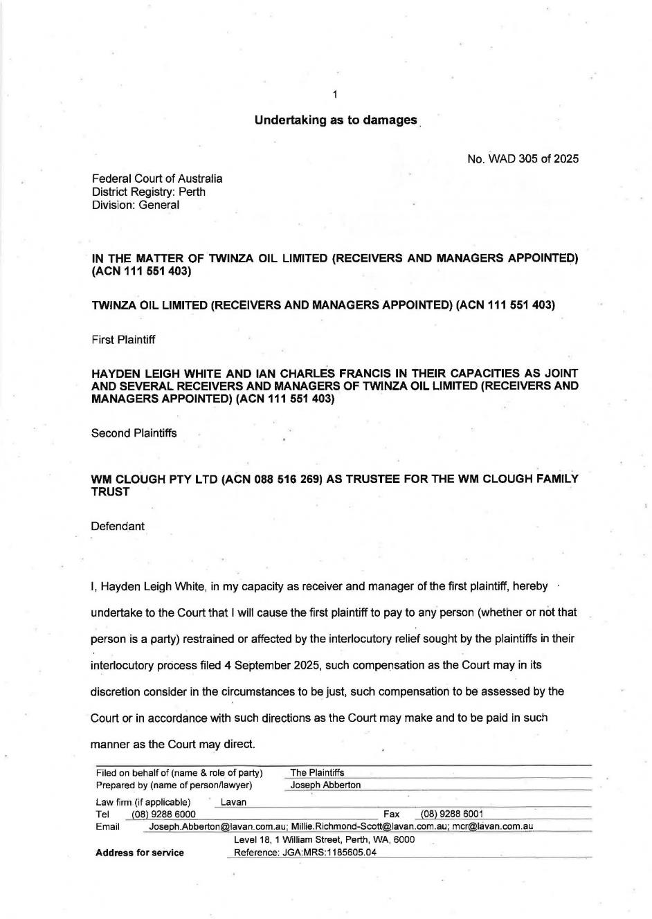 BETWEEN: | TWINZA OIL LIMITED (RECEIVERS AND MANAGERS APPOINTED) ACN 111 551 403 First Plaintiff HAYDEN LEIGH WHITE AND IAN CHARLES FRANCIS IN THEIR CAPACITIES AS JOINT AND SEVERAL RECEIVERS AND MANAGERS OF TWINZA OIL LIMITED (RECEIVERS AND MANAGERS APPOINTED) (ACN 111 551 403) Second Plaintiff | |