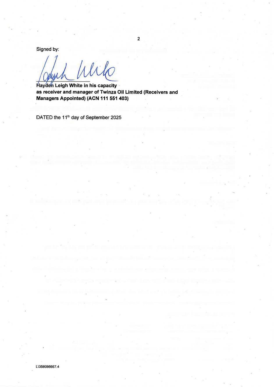 11 On 27 August 2025, the Court made orders amongst others, that the Receivers and Managers would be justified in causing Twinza to commence proceedings: White, in the matter of Twinza Oil Limited [2025] FCA 1054 (Twinza No 2) (Feutrill J).