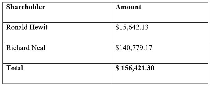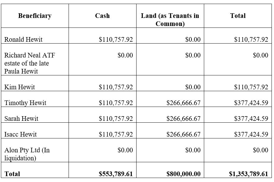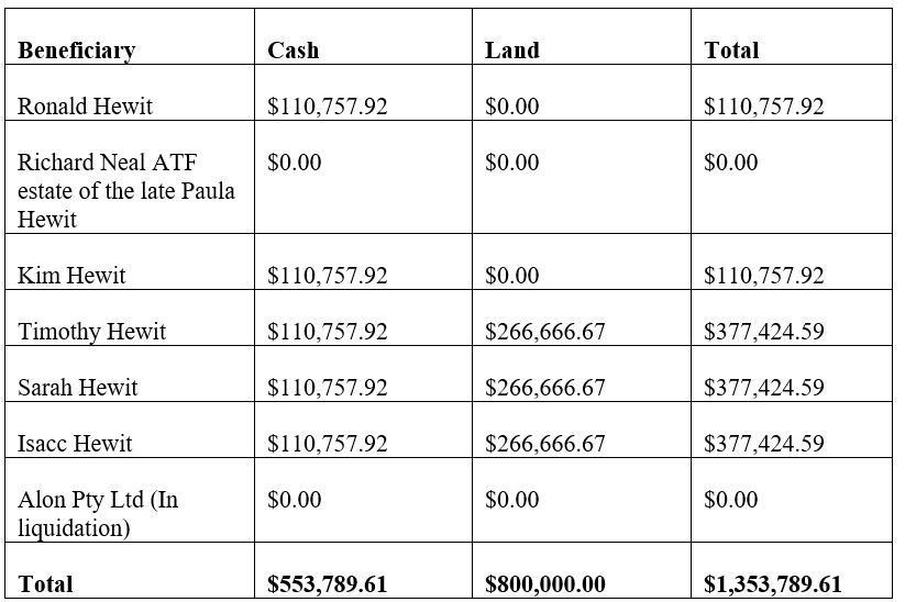 15 The current estimated return to shareholders of the Company is $156,421.30. There are two shareholders of the Company being Ronald Hewit (one share) and Richard Neal (nine shares). The proposed distribution to the shareholders is therefore:
