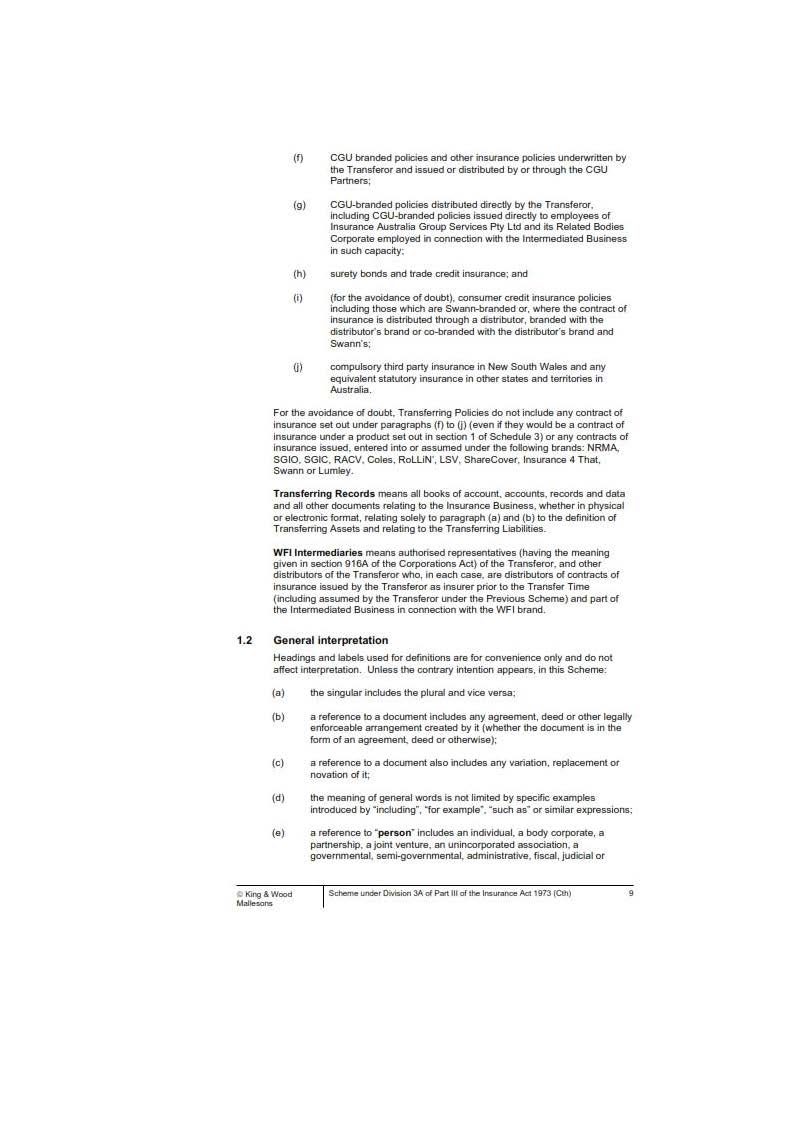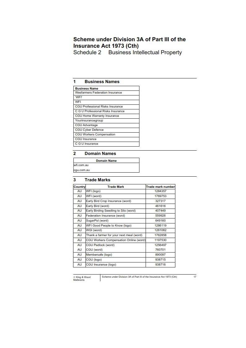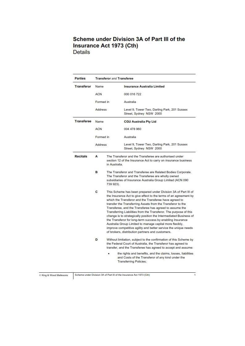 2 In short, the Scheme involves the intragroup transfer of the business of Intermediated Insurance Australia (IIA) – being one of the two operating divisions of IAL – in respect of policies issued under its active CGU Insurance (CGU) and WFI Insurance (WFI) brands, as well as (a) various IAL branded policies in “run-off”; and (b) certain defined business assets and agreements used for the purpose of conducting the IIA business (collectively, the Transferring Business).
