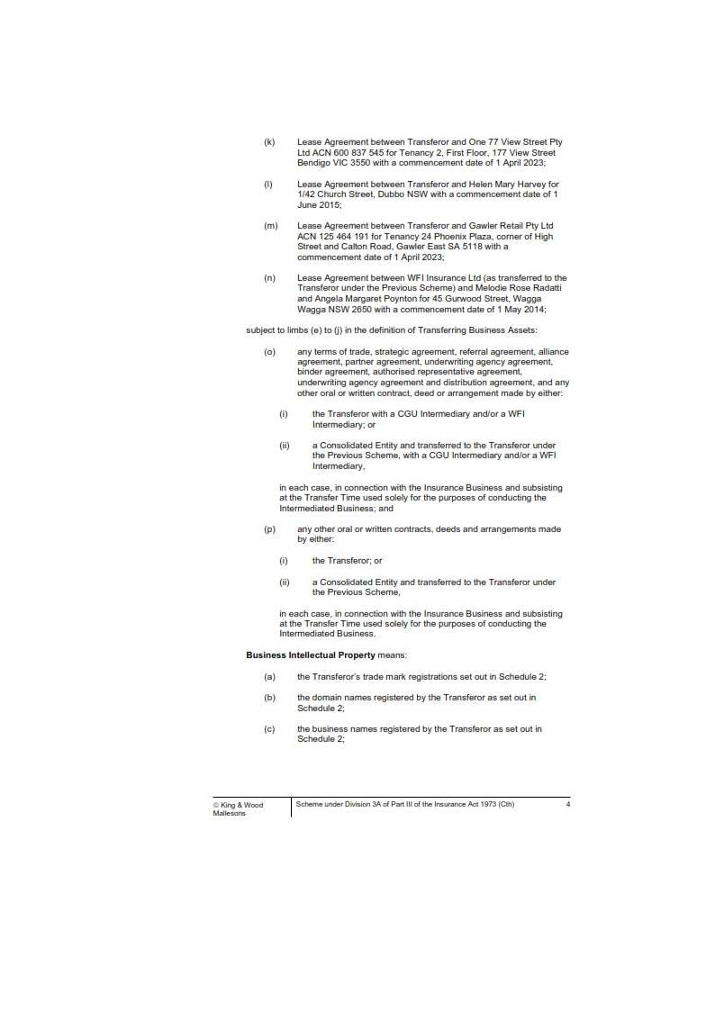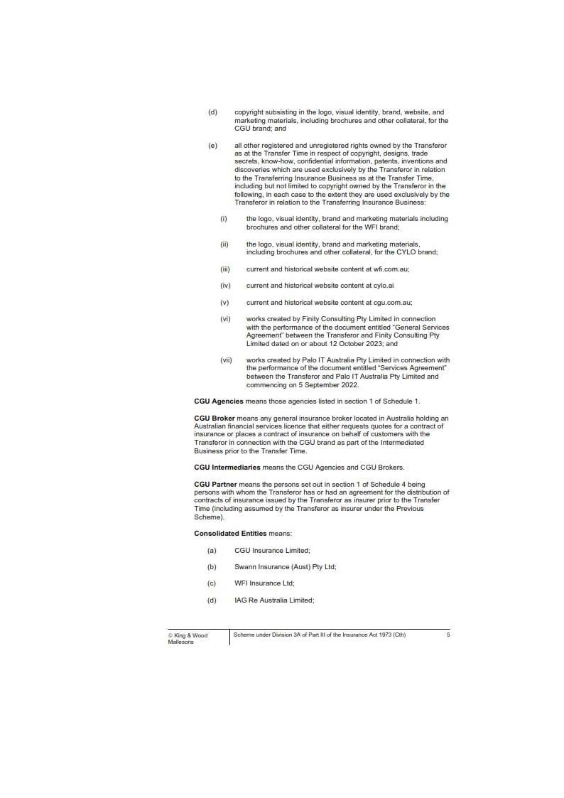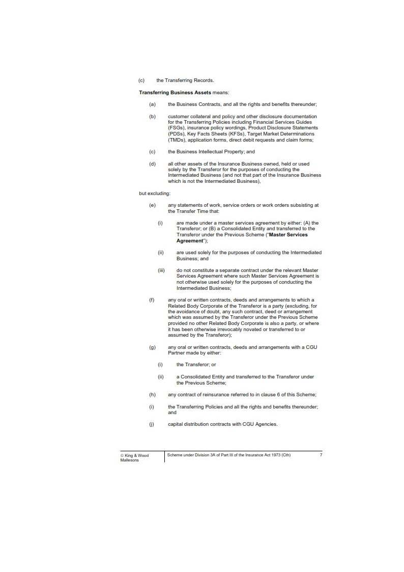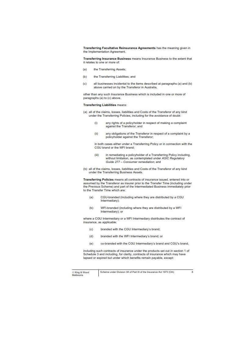 2 In short, the Scheme involves the intragroup transfer of the business of Intermediated Insurance Australia (IIA) – being one of the two operating divisions of IAL – in respect of policies issued under its active CGU Insurance (CGU) and WFI Insurance (WFI) brands, as well as (a) various IAL branded policies in “run-off”; and (b) certain defined business assets and agreements used for the purpose of conducting the IIA business (collectively, the Transferring Business).