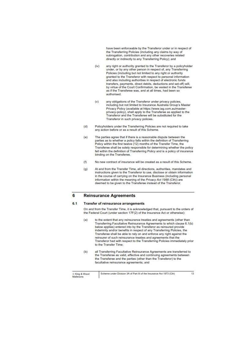 (5) IAG’s approach to claim management processes is governed by a group-wide policy applicable to all IAG subsidiaries (with the corollary being that the Scheme would not effect any alteration to those processes) (at Item 2.4.1); and