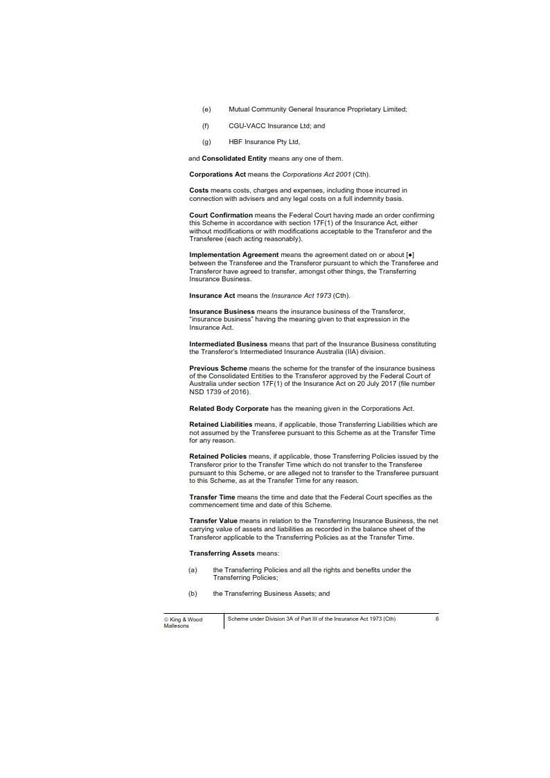 21 The Scheme gives effect to an Implementation Agreement executed by IAL and CGUA (dated 12 June 2025) which, inter alia, sets out the commercial arrangements between them in relation to the sale and transfer of the Transferring Business. The key elements of such are set out at in In the matter of Insurance Australia (at [35]). In short, although the Scheme envisages the internal reorganisation of the business of IAL, it does not involve a change to the terms binding, or the systems or processes for administering claims for, Transferring Policyholders.